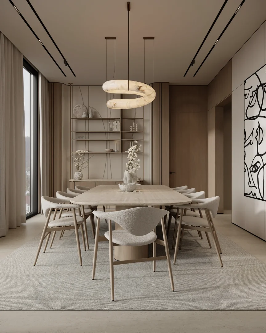 Bebek Waterfront Prime Collection’ın elit atmosferi için tasarlanan bu yemek odası takımı, sanat ve fonksiyonelliği birleştiriyor. Organik formlu, yekpare ayaklı heykelsi yemek masası, mekana akışkan bir yumuşaklık katarken; kavisli sırt yapısına sahip modern sandalyeler konforlu bir davet alanı yaratıyor. Üzerindeki enstalasyon tarzı aydınlatma ile birlikte bu grup, yemek odalarını modern bir sanat galerisine dönüştürüyor.