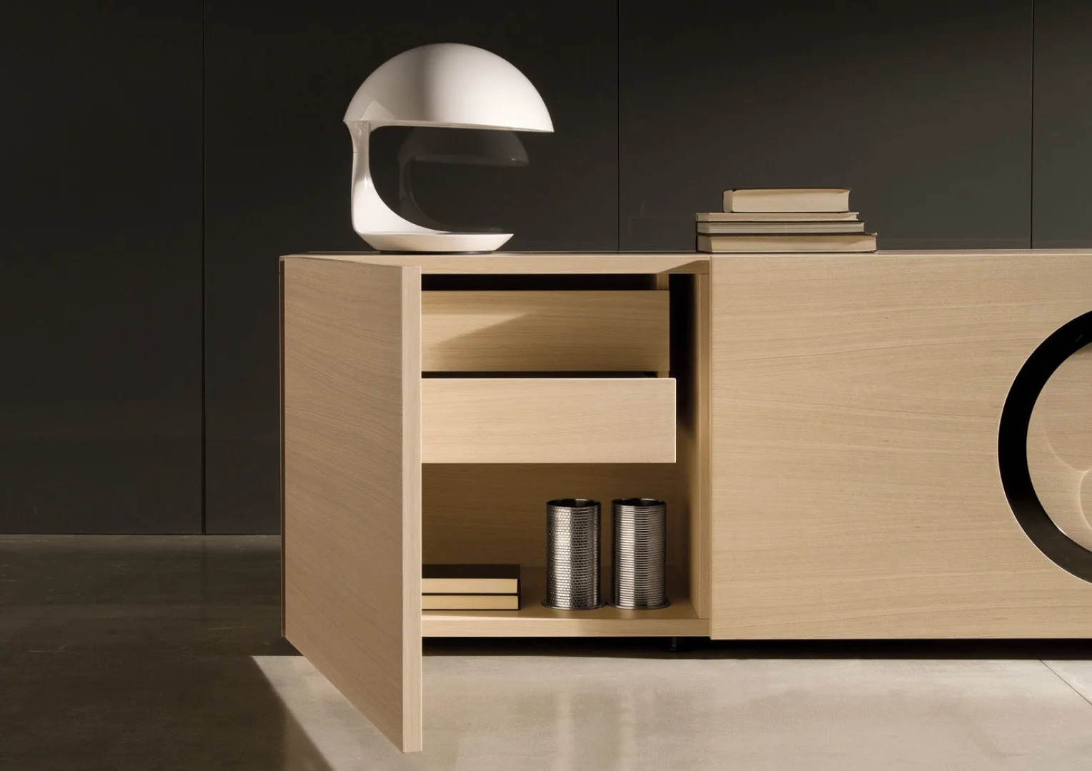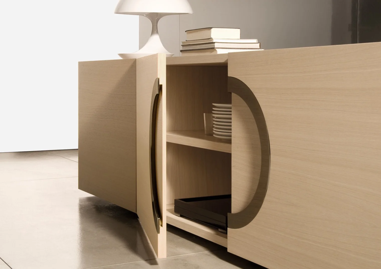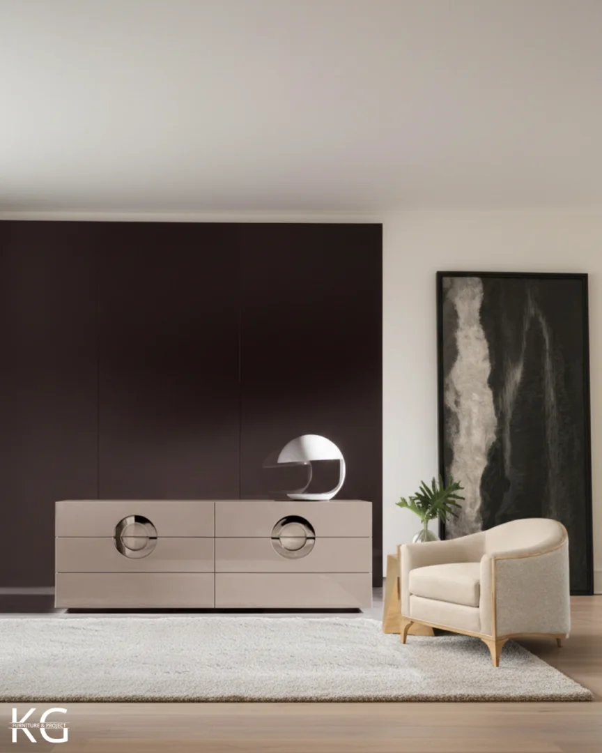 Koleksiyonun imza parçası olan bu konsol, minimalist ahşap gövdesini tamamlayan devasa dairesel kulp detayıyla heykelsi bir sanat eserini andırıyor. Yanında eşlik eden yüksek arkalıklı, petrol mavisi tasarım berjer ise ergonomik formu ve zıt renklerin uyumuyla, yaşam alanlarına sofistike ve karakteristik bir dokunuş katıyor.