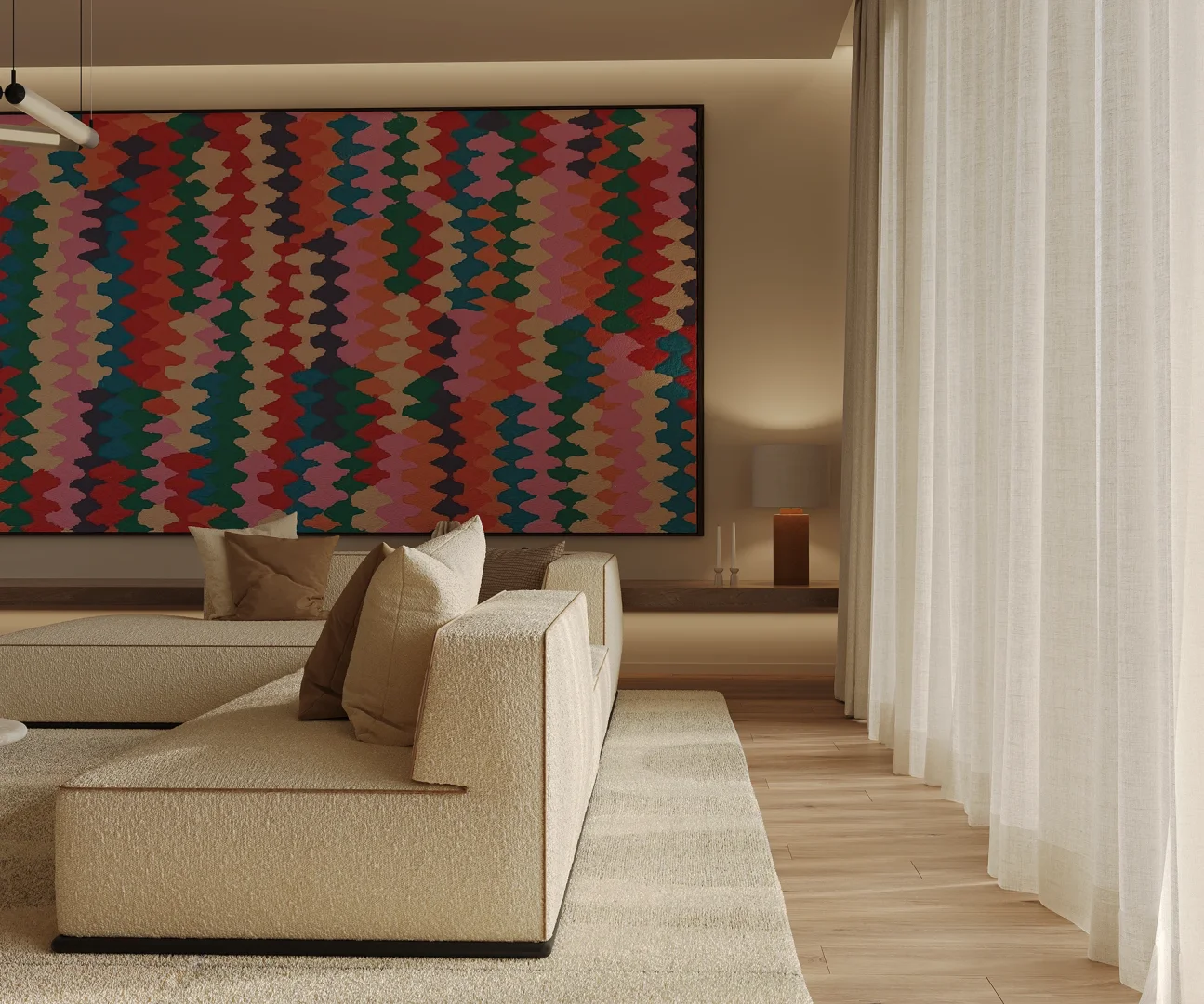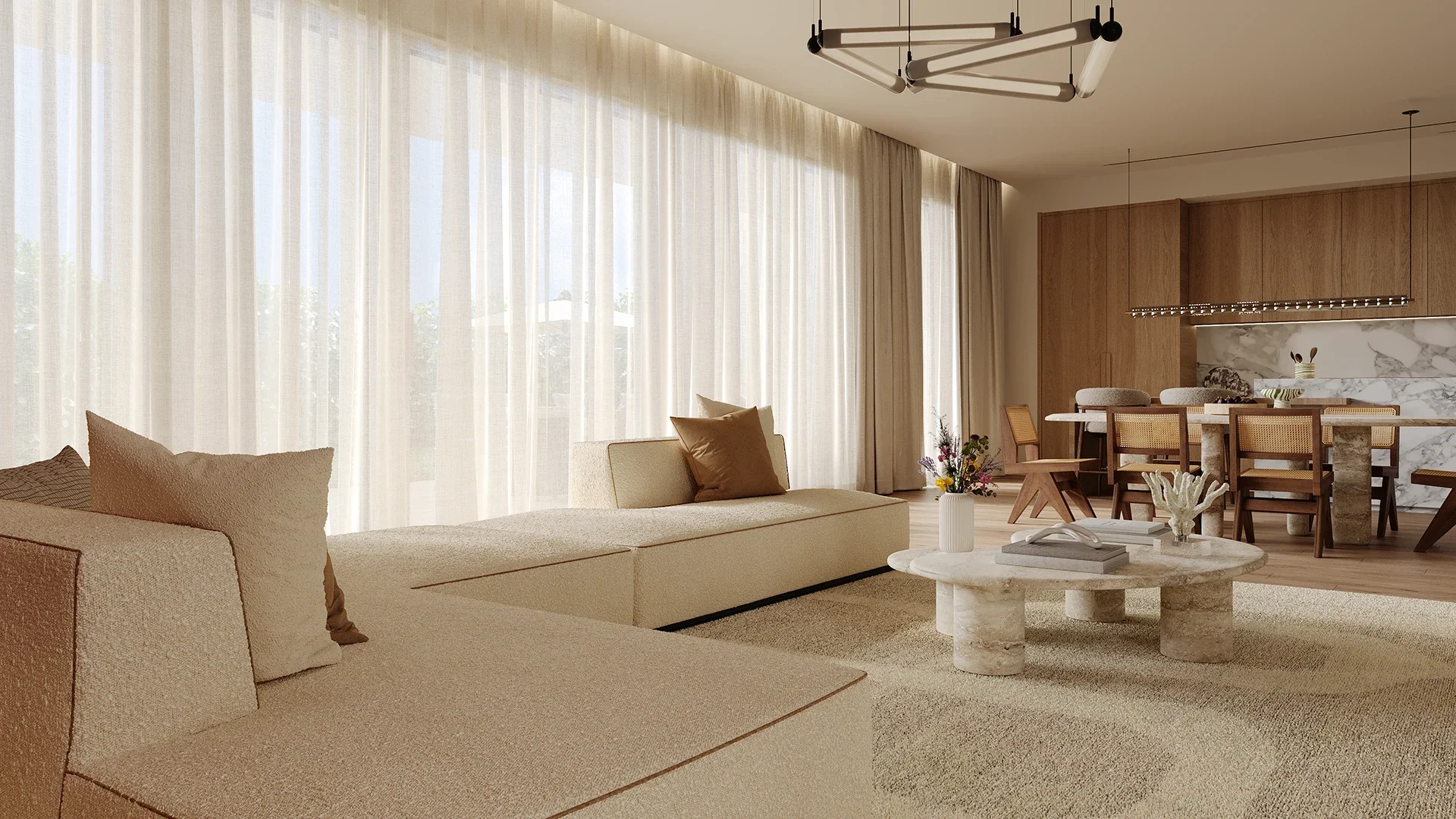 Kalkan Azure Bay Villas’ın ferah ruhunu yansıtan bu heykelsi doğal taş yemek masası, silindirik ayak yapısı ve pürüzsüz yüzeyiyle organik minimalizmi temsil ediyor. Ona eşlik eden masif ahşap ve hazeran (rattan) detaylı sandalyeler ise takıma sıcak, Akdeniz esintili bir dokunuş katarak yemek alanında hem doğal hem de seçkin bir atmosfer yaratıyor.