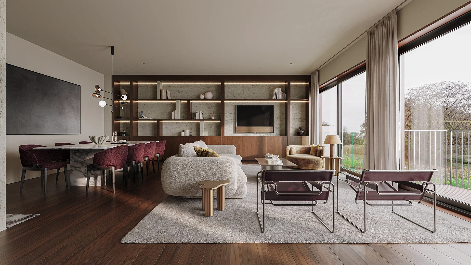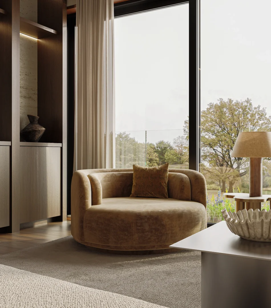 Napa Valley Serenity Homes projesinin kalbi olan bu özel tasarım mermer mutfak adası, "waterfall" (şelale) kenar bitişi ve doğal taş dokusuyla heykelsi bir duruş sergiliyor. Arkasındaki koyu ahşap kaplama ankastre dolap sistemiyle yarattığı sofistike kontrast, fonksiyonelliği sanatla buluşturarak modern mutfakları sadece yemek pişirilen değil, yaşanan bir alana dönüştürüyor.