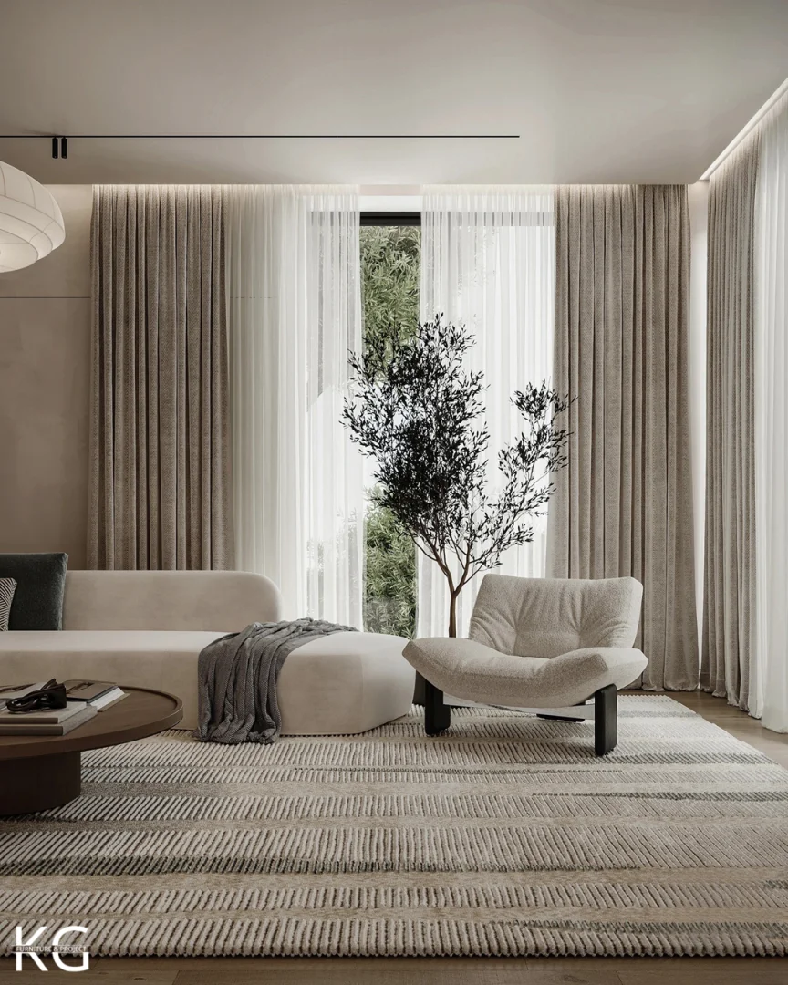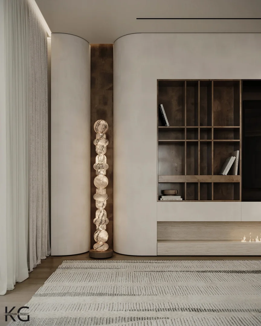 Palm Desert Mirage Living atmosferinin dinginliğini yansıtan bu minimalist kavisli kanepe (curved sofa), akışkan formuyla mekana yumuşak ve organik bir geçiş kazandırıyor. Boydan boya uzanan yekpare görünümü ve nötr tonlardaki premium kumaşıyla ferahlık hissini artırırken, kalabalık davetler için geniş ve lüks bir oturma alanı sağlıyor.