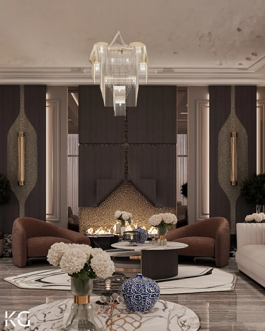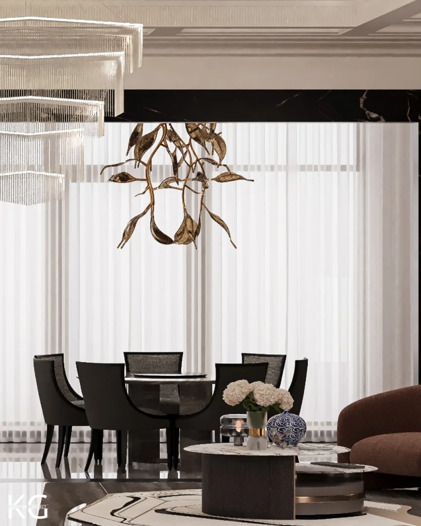 Paris apartmanlarının yüksek tavanlı ihtişamını salonlara taşıyan bu tasarımda, Art Deco esintili katmanlı kristal avize başrolü üstleniyor. Metal ve mermerin kusursuz uyumuyla tasarlanan lüks orta sehpa grubu ve modern hatlara sahip krem rengi kanepe, klasik kemerli pencerelerin önünde zamansız, aydınlık ve aristokrat bir yaşam alanı sunuyor.
