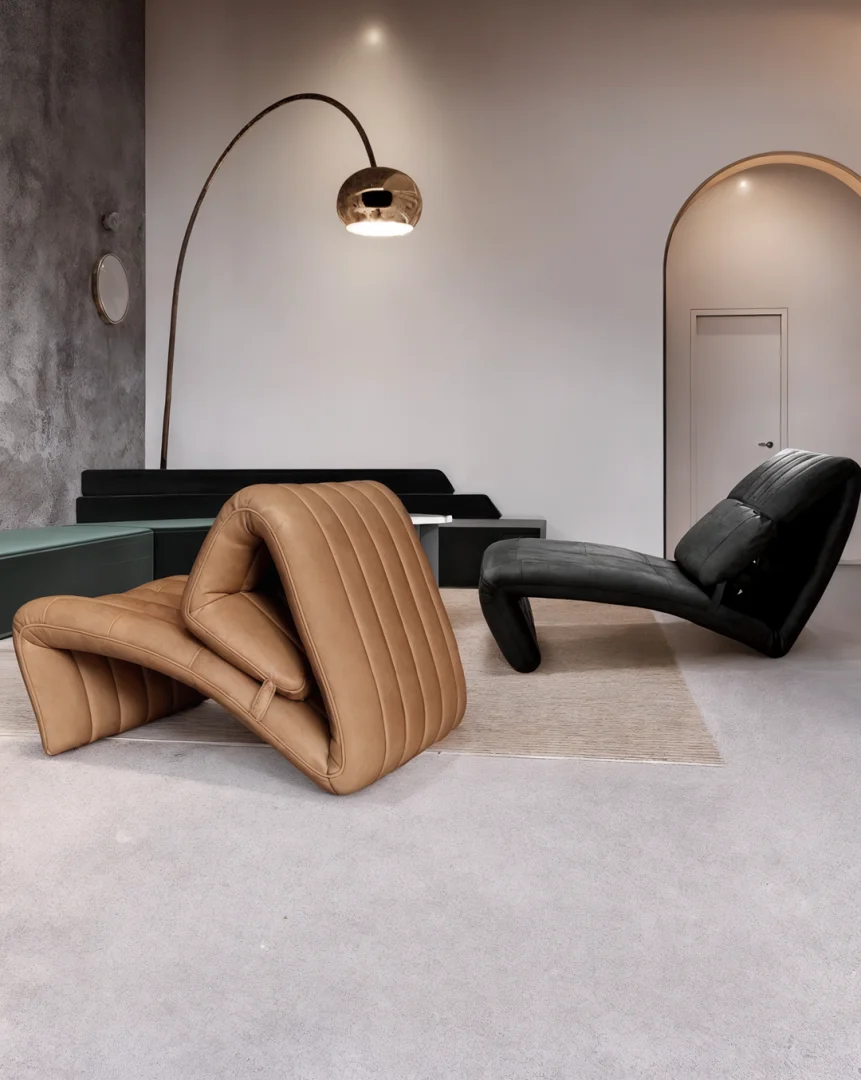 Sıradan bir oturma elemanı değil, adeta bir sanat eseri olan bu heykelsi dinlenme koltuğu, dalgalı formu ve kesintisiz devam eden kapitone (channel tufted) dikişleriyle avangart lüksü tanımlıyor. Taba rengi eskitme deri döşemesi, mekana maskülen ve sıcak bir karakter katarken; ergonomik kıvrımları penthouse daireler için konforlu ve iddialı bir stil ikonu haline geliyor.