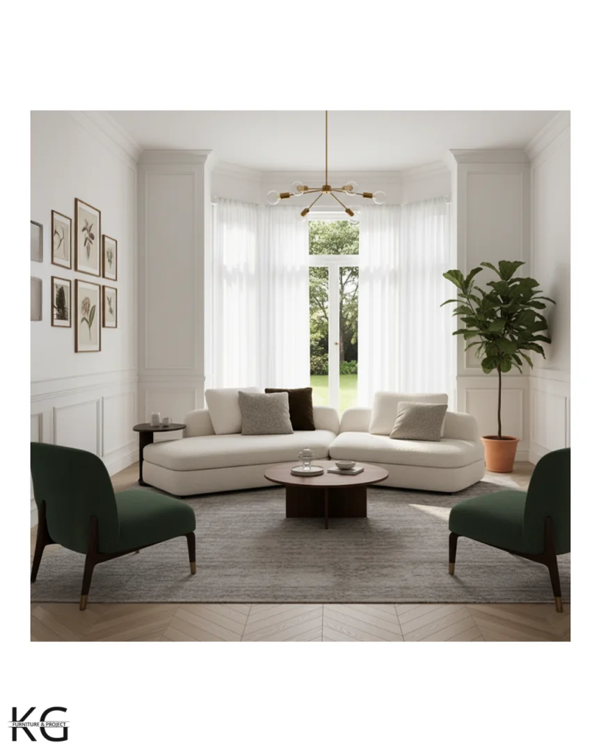 Mekana akışkanlık kazandıran bu kavisli (curved) kanepe, keskin köşelerden uzak organik formuyla son dönemin "soft luxury" trendini yansıtıyor. Krem rengi buklet (bouclé) dokulu kumaşı, heykelsi duruşu ve ergonomik sırt yapısı; salonun merkezinde davetkar bir ada oluşturarak hem görsel bir zarafet hem de sıcak, samimi bir sohbet ortamı vadediyor.