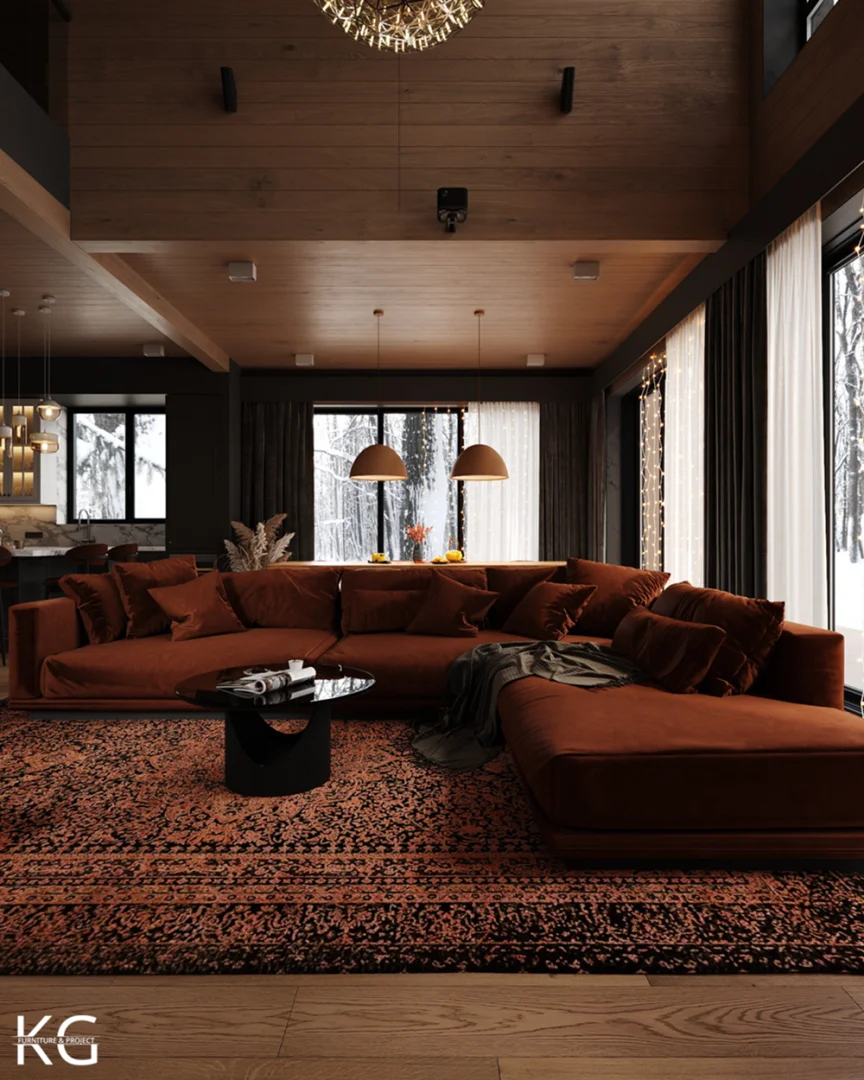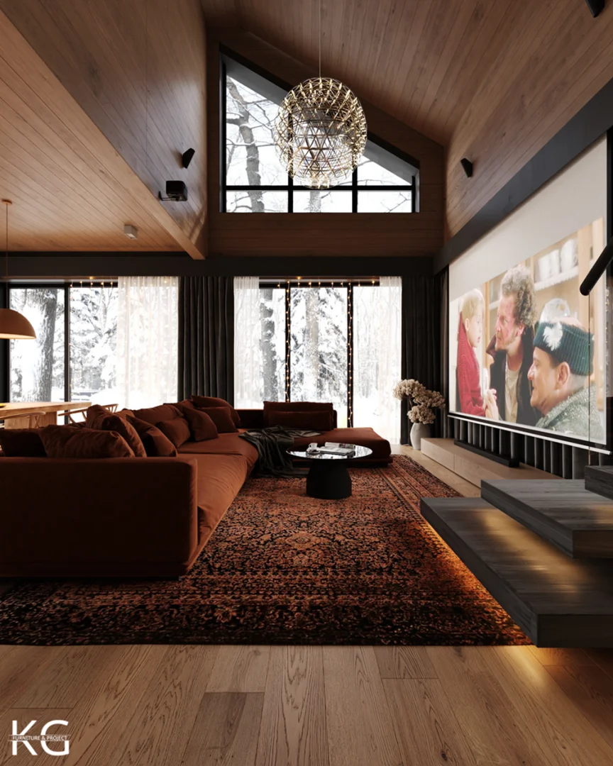 Japon minimalizmi ile İskandinav işlevselliğini (Japandi) harmanlayan bu yemek odası tasarımı, mekanın merkezine yerleşen masif meşe yemek masası ile doğallığı yüceltiyor. Masanın blok ayaklı güçlü duruşuna eşlik eden hasır örgülü ikonik ahşap sandalyeler ve devasa ahşap sarkıt aydınlatmalar, kış manzarasına karşı sıcak, organik ve dingin bir toplanma alanı sunuyor.