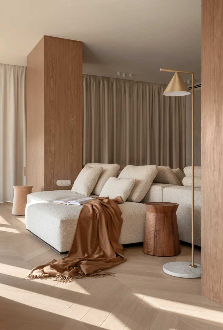 Vienna Crown Vintage Project’in nostaljik ruhunu modern bir dokunuşla yorumlayan bu özel tasarım yaşam alanı, doğal ceviz kaplama duvar panelleri ve entegre "floating" (duvara monte) TV ünitesiyle mekana mimari bir derinlik katıyor. Takımı tamamlayan kiremit rengi, deri silindir yastıklı daybed (uzanma koltuğu) ise hem okuma köşeleri hem de dinlenme alanları için sofistike, sıcak ve konforlu bir "mid-century modern" deneyimi sunuyor.